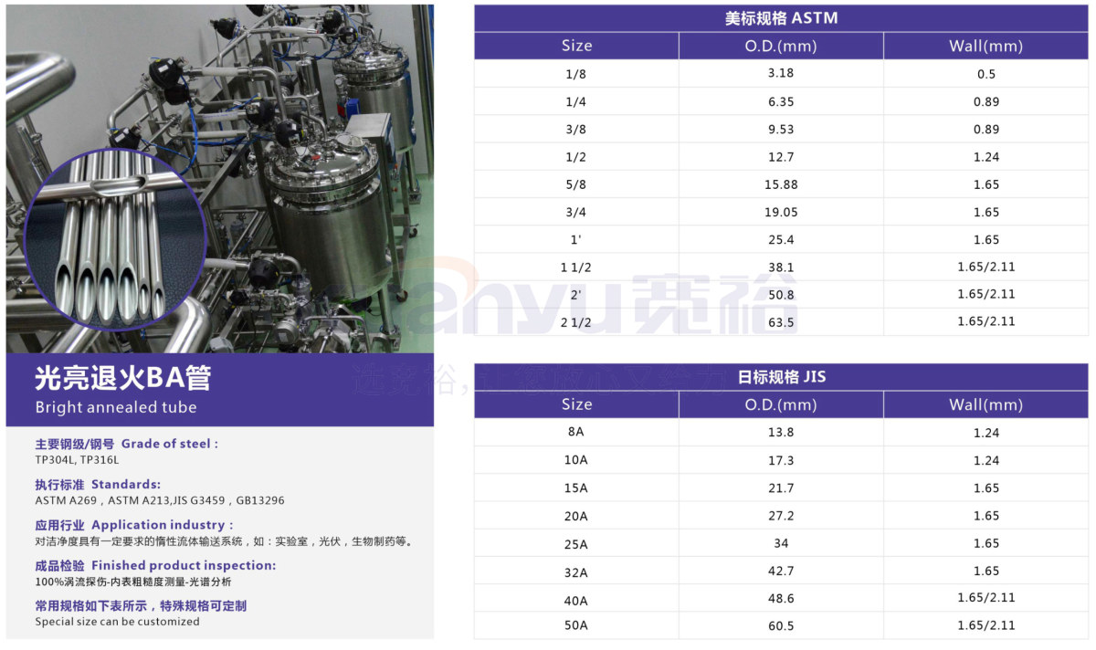 應(yīng)用領(lǐng)域:不銹鋼光亮退火B(yǎng)A管, 醫(yī)療脫脂不銹鋼管,不銹鋼BA級管,不銹鋼潔凈級管,符合美標(biāo)規(guī)格ASTM、日標(biāo)規(guī)格JIS。
