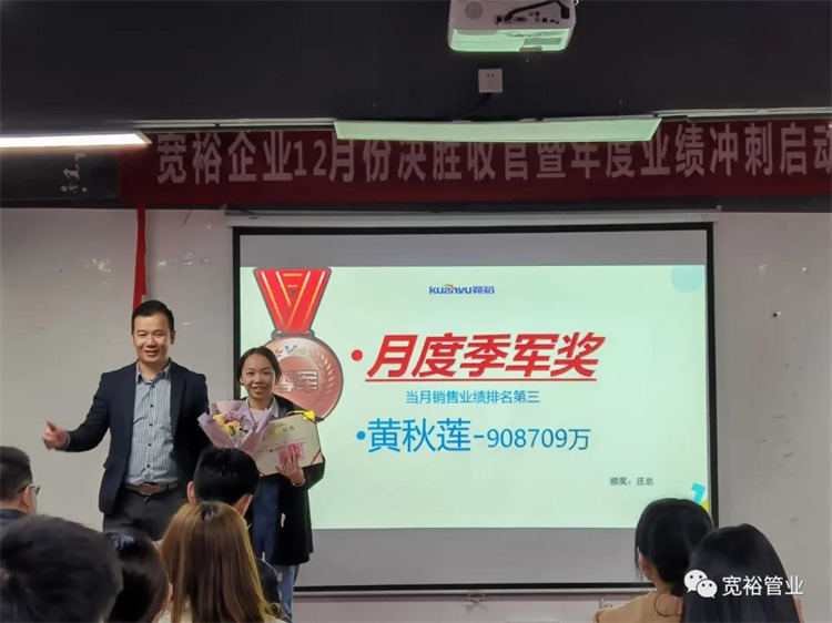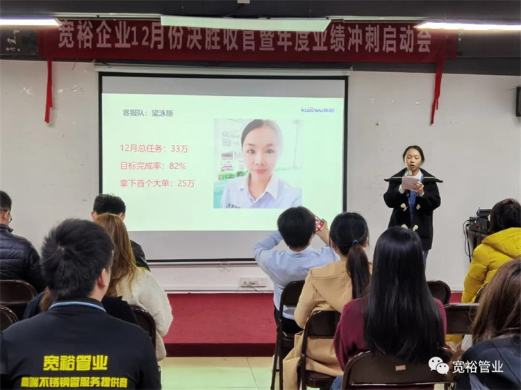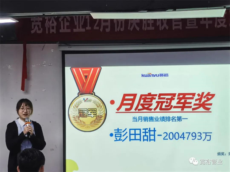 動(dòng)感滿滿的舞蹈之后正式開(kāi)啟對(duì)12月1-13日的銷售業(yè)績(jī)回顧,并對(duì)個(gè)人銷量前十、團(tuán)隊(duì)業(yè)績(jī)完成情況、團(tuán)隊(duì)PK情況等進(jìn)行了總結(jié)。在過(guò)去的13天里,已經(jīng)涌現(xiàn)出了多位優(yōu)秀的將士,他們分別是以100%業(yè)績(jī)率先沖刺的00后新生代“小莊”,還有首個(gè)拿下本月25萬(wàn)大單的小斯---從跟單員通過(guò)不斷的努力成為優(yōu)秀的銷售工程師。更有通過(guò)前期不斷積累了成功開(kāi)拓經(jīng)驗(yàn)的來(lái)自無(wú)敵隊(duì)的小黃,12月至今已經(jīng)開(kāi)發(fā)了6個(gè)新客戶,現(xiàn)場(chǎng)更是迎來(lái)了“哇塞”的喝彩聲一片!在此小編也僅代表寬裕管業(yè)對(duì)各位優(yōu)秀戰(zhàn)士的優(yōu)異成績(jī)表示大寫的點(diǎn)贊!你們是最棒的!
