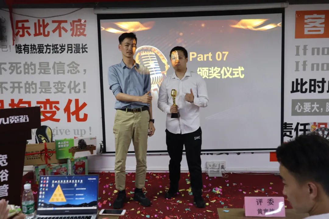經(jīng)過2.5小時(shí)的激勵(lì)角逐,在15名參賽選手中,最終決出了本次金話筒比賽的冠亞季軍,他們分別是網(wǎng)絡(luò)運(yùn)營(yíng)部的陳森(冠軍)、創(chuàng)美佳的銷售工程師單香君(亞軍)、無敵隊(duì)的銷售工程師陳加欣(季軍)。卓越啦啦隊(duì)則由呼聲最高的無敵隊(duì)獲得!