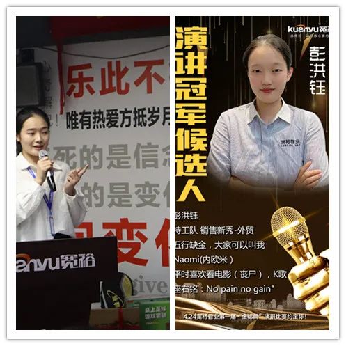 來自外貿(mào)部的彭洪鈺,連續(xù)幾天苦練,在開賽前一天更是練習(xí)到凌晨,她說害怕自己表現(xiàn)不好給團(tuán)隊(duì)丟臉。而她的主管Eagle更是親自積極主動(dòng)輔導(dǎo),更帶領(lǐng)團(tuán)隊(duì)小伙伴為其加油鼓勁!你知道嗎洪鈺,雖然你最后并沒躋身前三,但你已經(jīng)出色完成了本次的比賽,外貿(mào)部和寬裕都以你為榮!we are proud of you~