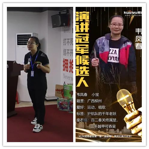 ? 來自護(hù)航隊(duì)的韋姐,自稱“千年老妖”,是倉儲(chǔ)部的主管,為人熱心,工作負(fù)責(zé),帶領(lǐng)全體倉儲(chǔ)部同事兢兢業(yè)業(yè)為銷售伙伴提供優(yōu)質(zhì)的后勤保障服務(wù)。忙碌的倉儲(chǔ)工作讓韋姐未能參加前期的培訓(xùn),但她利用晚上的時(shí)間自己制作ppt,在比賽前半天閉關(guān)演練?!翱嘈娜耍觳回?fù)!” 韋姐的苦練換來了演講當(dāng)天的出色表現(xiàn)!其流暢自如,氣勢(shì)如虹,支持者眾!
