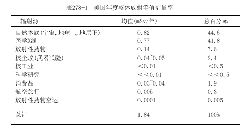 常用的測量單位是倫琴,戈瑞(Gy)和希沃特(Sv).倫琴(R)是空氣中x或γ電離輻射的計(jì)量單位,戈瑞是被各組織或物質(zhì)吸收的能量計(jì)量單位,它可應(yīng)用于各類輻射.R和厘戈瑞(cGy)基本上是相等的.在說明生物學(xué)效應(yīng)時(shí),Sv與經(jīng)質(zhì)量因子校正的Gy相等.因?yàn)閷σ欢康哪芰慷?不同類型的輻射可產(chǎn)生不同的生物學(xué)效應(yīng);例如,中子有較大的效應(yīng).對X和γ輻射,Sv與Gy相等.在現(xiàn)代術(shù)語中Gy和Sv已替代拉德(rad)和雷姆(rem),Gy=100rad,Sv=100rem.在非專業(yè)刊物中常常將輻射分為低水平輻射(0.2~0.3Gy)和高水平輻射(>0.3Gy).而醫(yī)學(xué)劑量一般為<0.05Gy,而且常常<0.01Gy.地球及其大氣的本底放射活性水平很低,而不能測知其效應(yīng)(表278-1).